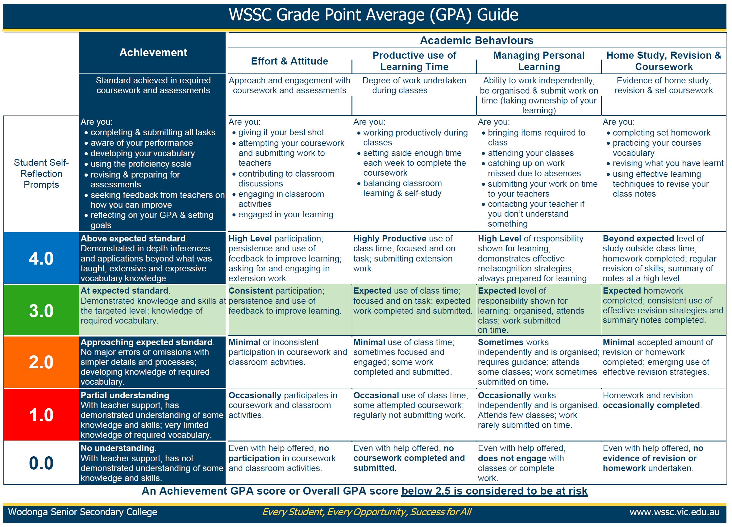 It is expected that every student can achieve a minimum of 3 as a GPA, regardless of academic ability.  Any student who receives a subject GPA average below 2.5 is considered at risk.